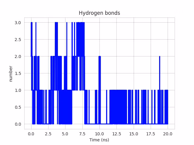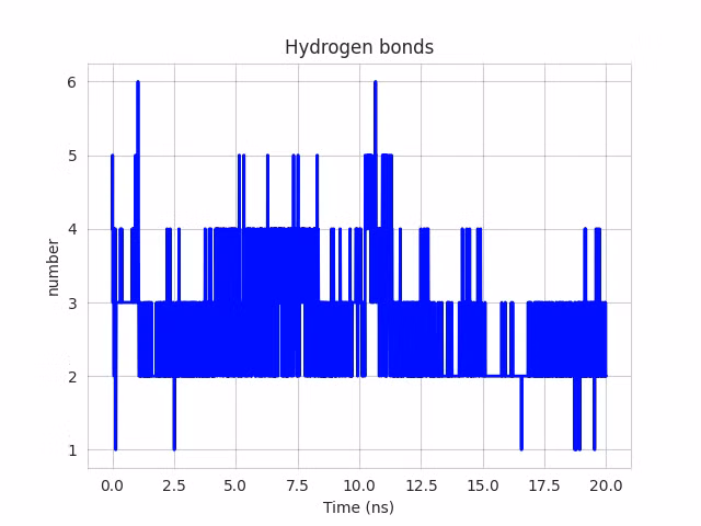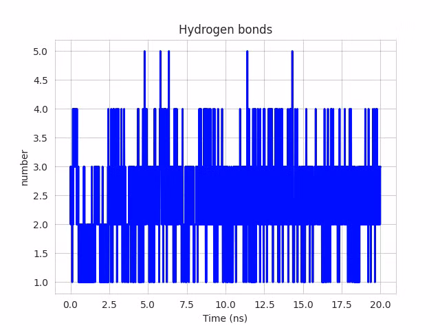 Xét đến chỉ số liên kết hydro trong quá trình mô phỏng động lực học phân tử, Kaempferol có số liên kết hydro trung bình chỉ 0.56, với giá trị cao nhất đạt 3, trong khi đó, Myricetin có kết quả hơn rõ rệt với số liên kết trung bình đạt 2.66 và số liên kết tối đa lên đến 6. Điều này cho thấy Myricetin không chỉ có ái lực mạnh hơn mà còn duy trì trạng thái gắn kết bền vững hơn so với Kaempferol.