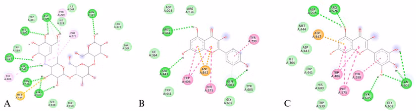 Trong nghiên cứu của Hui C [25] và Normah H [26], cả Myricetin và Kaempferol đều thể hiện khả năng ức chế α-glucosidase, nhưng Myricetin vượt trội hơn với tỷ lệ ức chế 94% (so với 82% của Kaempferol). Phân tích in silico Myricetin có năng lượng liên kết thấp hơn Kaempferol (-7.6 kcal/mol so với -7.4 kcal/mol) và với đề tài nhóm nghiên cứu cũng cho kết quả tương tự. Phức hợp giữa α-glucosidase và Myricetin có năng lượng liên kết -8.0 kcal/mol và Kaempferol là -7.4 kcal/mol, trong khi đó chứng dương Acarbose đạt -7.4 kcal/mol. Hai acid amin quan trọng trong hoạt động thủy phân của enzym α-glucosidase (Asp443 và Asp542) được cả Myricetin và Kaempferol tương tác nhưng lại khác loại liên kết lần lượt là liên kết hydro và Van der Waals. Còn với Asp542, cả 2 ligand đều hình thành liên kết π-anion tại nhân chromone.